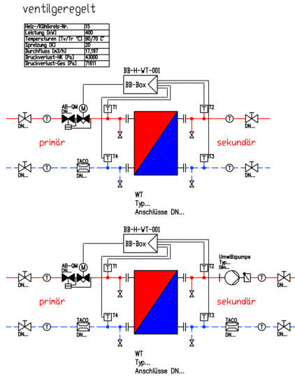 Autodynamische, autarke Regelung und autodynamischer, hydraulischer Abgleich eines Wärmetauschers mit: FluCoS GmbH&CoKG - BB-Box-WT-H-001 bei Wärmeübertragung / Heizung FluCoS GmbH&CoKG - BB-Box-WT-K-001 bei Kälteübertragung / Kühlung Diese Plug&Play-Regelung regelt die Sekundärsolltemperatur eines Wärmetauschers und gleichen diesen vollautomatisch und autodynamisch ab,d.h. über speziell entwickelte Regelalgorithmen wird die primärseitige Heizwasserversorgung so an den sekundären Heizwasserverbrauch stetig angepasst und geregelt, dass eine vorgegebene sekundäre Sollwerttemperatur entweder konstant oder in Abhängigkeit einer Außentemperatur- führung oder nach Kennlinie präzise gefahren werden kann. Durch die Regelung wird zudem gewährleistet, dass in jedem Betriebszustand die Grädigkeit zwischen Versorgungs- und Verbraucherkreis gehalten wird. Die Regelung arbeitet hochpräzise und gleicht kleinste Schwankungen im Primärkreis (Versorgung) und Sekundärkreis (Verbraucher) vollautomatisch aus. Bei so ausgestatteten Fluid-Verteilnetzen mit mehreren Wärmetauschern erfolgt in jedem Betriebszustand ein autodynamischer, hydraulischer Abgleich der Verbraucher untereinander und somit der autodynamische, hydraulische Abgleich des gesamten Fluidnetzes. Die Lieferung erfolgt inkl. aller Fühler sowie Mess- und Steuerleitungen. lm Lieferumfang enthalten sind: 4 Stück Temperaturfühler L=100mm, inkl. Tauchhülsen, anschlussfertig verdrahtet  vorkonfektionierte Leitungen (Länge=5 m) für Temperaturfühler und 0-10V-Steuerleitung (für Pumpen und Ventilantriebe). Die vorkonfektionierten Leitungen werden mit schraubbaren Kabelsteckern am Regelungsgehäuse angeschlossen. Optional können auch längere Temperaturfühler und Tauchhülsen bestellt und geliefert werden. Die Montage erfolgt durch: Befestigen des Regelungsschaltkastens (lP43, optional IP67) an bauseitige Wand oder Konsole Einstecken der Temperaturfühler in die vormontierten Tauchhülsen und Anklemmen der Leitungen mit schraubbaren Kabelsteckern Anklemmen eines optionalen Außentemperaturfühlers (nicht im Basispaket enthalten) mit schraubbarem Kabelstecker Anklemmen der MODbus-GLT-Busleitung mit schraubbarem Kabelstecker Anklemmen der 0-10V-Steuerleitung an die bauseitige Pumpe oder das bauseitige Ventil Montage und Anschlussarbeiten erfolgen bauseits. Diese Dienstleistungen können auf Wunsch optional mit angeboten werden. Die Inbetriebnahme erfolgt durch: einstecken des Schuko-Steckers in eine bauseitige Schuko-Steckdose Die Bedienung (Sollwertvorgabe für den Sekundärkreis) erfolgt entweder über die Tasteneingabe am Display der Regelung oder über die GLT via MODbus-Kommunikation (Kommunikationsprotokoll ist beigefügt) optional weitere GLT-Schnittstellen (auf Anfrage möglich) Es sind keine weiteren Regelparameter einzugeben und zu konfigurieren. Via Display oder MODbus werden die Eingangs- und Ausgangstemperaturen am Wärmetauscher angezeigt . Optional können abhängig von Pumpen-/Ventiltyp auch Durchfluss und Wärmemengen (Wärmeleistung) angezeigt werden. Diese sind nicht geeicht, verfügen jedoch über hinreichende Genauigkeit für die Anlagenbeurteilung. Optional kann die Regelung auch mit einem Datenlogger ausgestattet werden. Abschließender Hinweis: Neben Regelungen für Wärmetauscher bietet FluCoS auch entsprechende BB-Box-Regelungen an für: Heiz-/Kühlregister hydraulische Weichen, Pufferspeicher und Hydraulikbehälter Drosselschaltungen und Einspritzschaltungen Beimischschaltungen und Bypassschaltungen Umlenkschaltungen und Verteilschaltungen